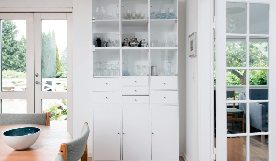 Use feltros ou pequenos tapetes nas prateleiras para proteger objetos delicados. Isso também evita que peças deslizem quando as portas são abertas ou fechadas.